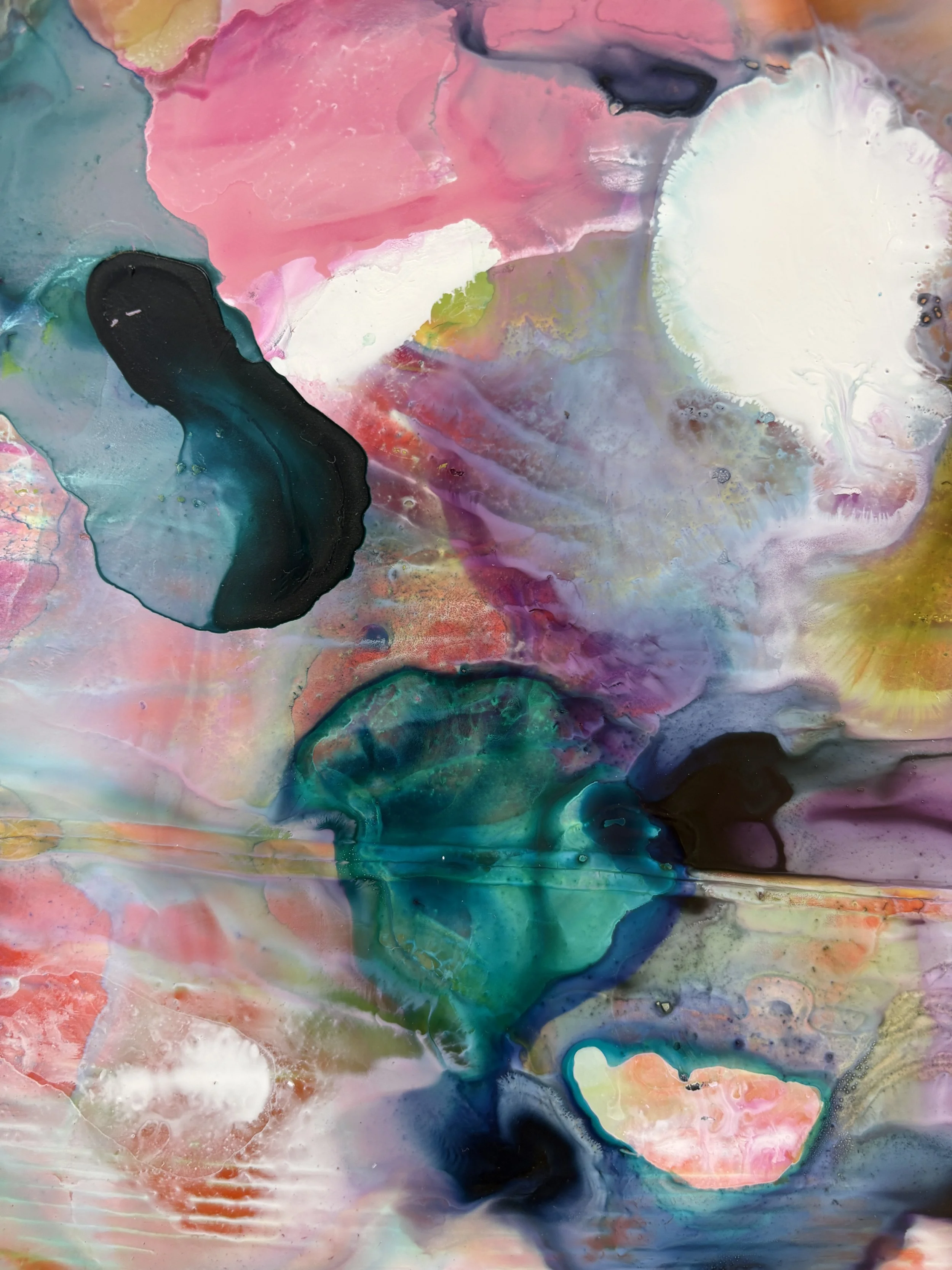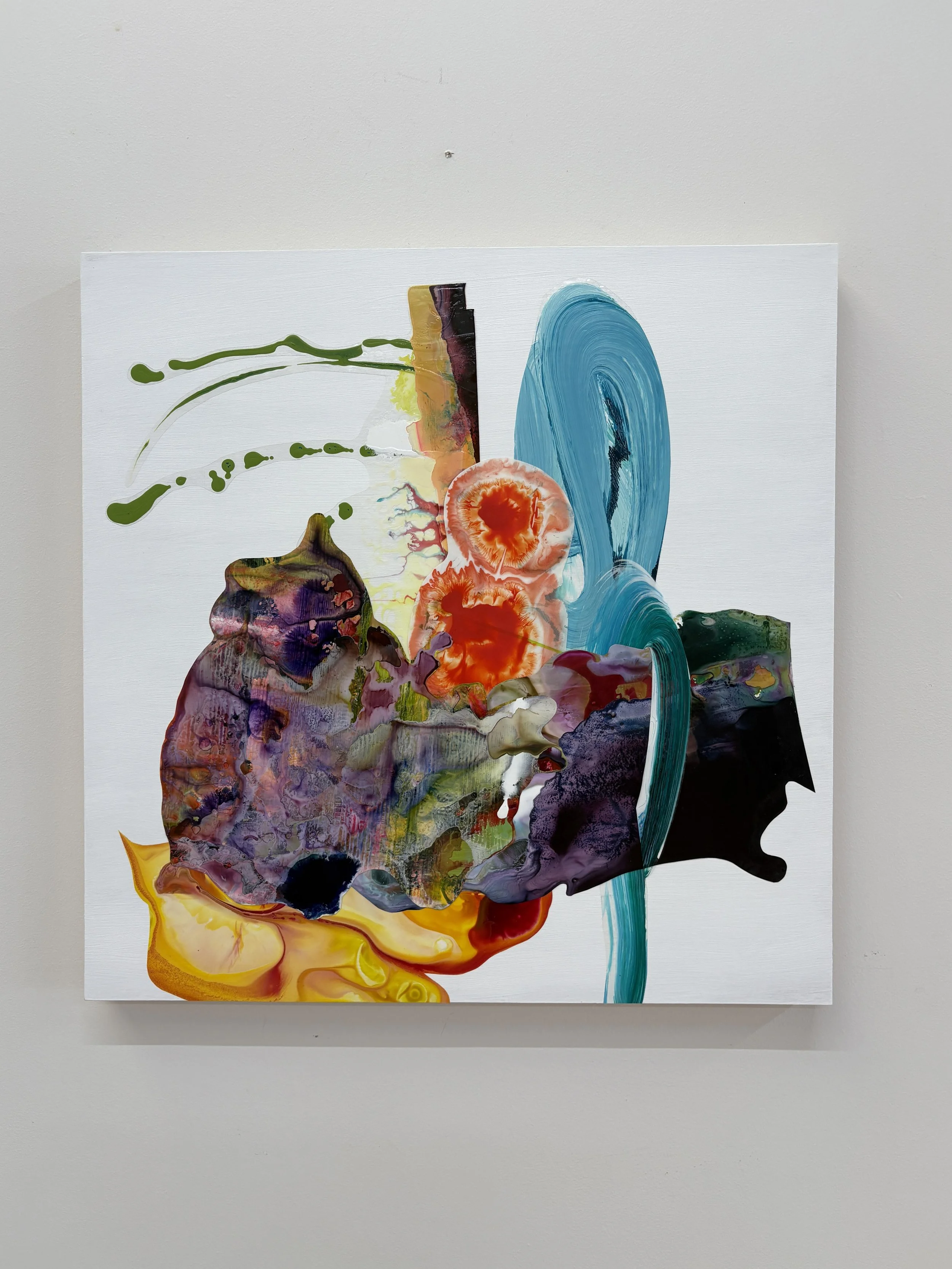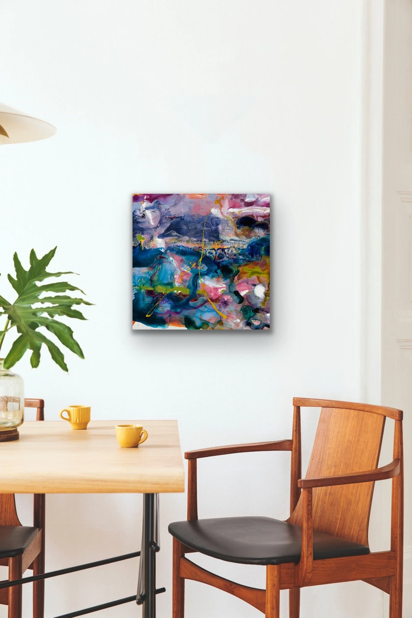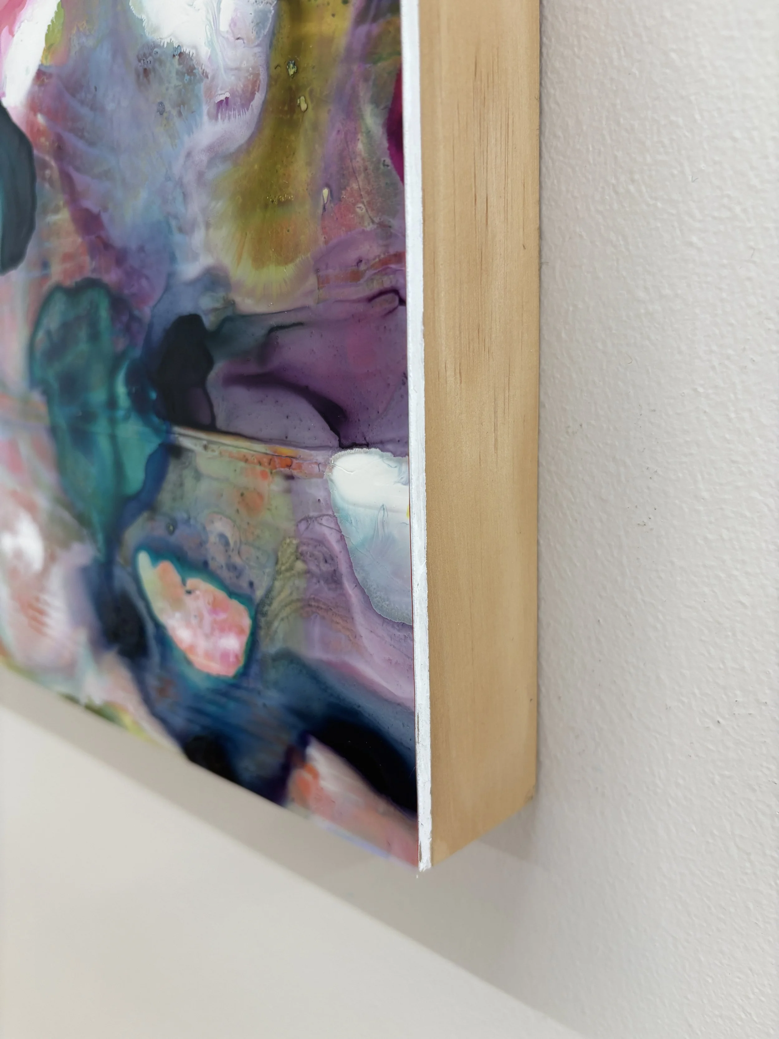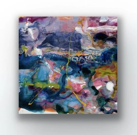 Inspired by the natural world, this painting carries soft floral references — the movement of petals, the play of light after rain, the pulse of color in a summer garden. Layers of acrylic on Dura-Lar create luminous depth and energy, capturing nature’s rhythm in abstract form.