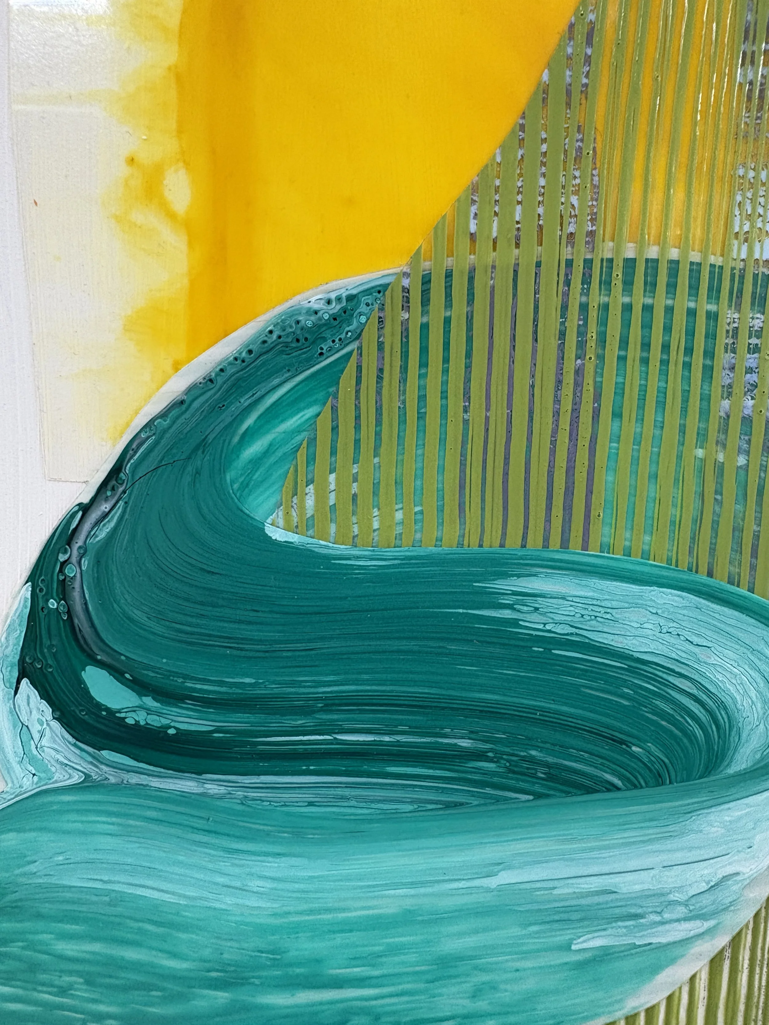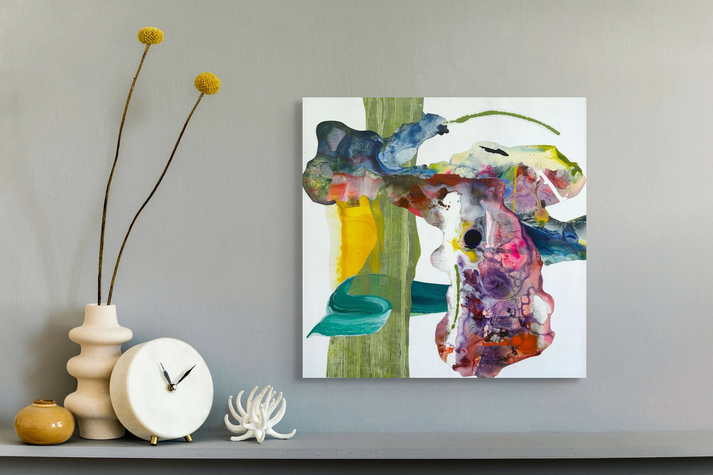 Inspired by the natural world, this painting carries soft floral references — the movement of petals, the play of light after rain, the pulse of color in a summer garden. Layers of acrylic on Dura-Lar create luminous depth and energy, capturing nature’s rhythm in abstract form.